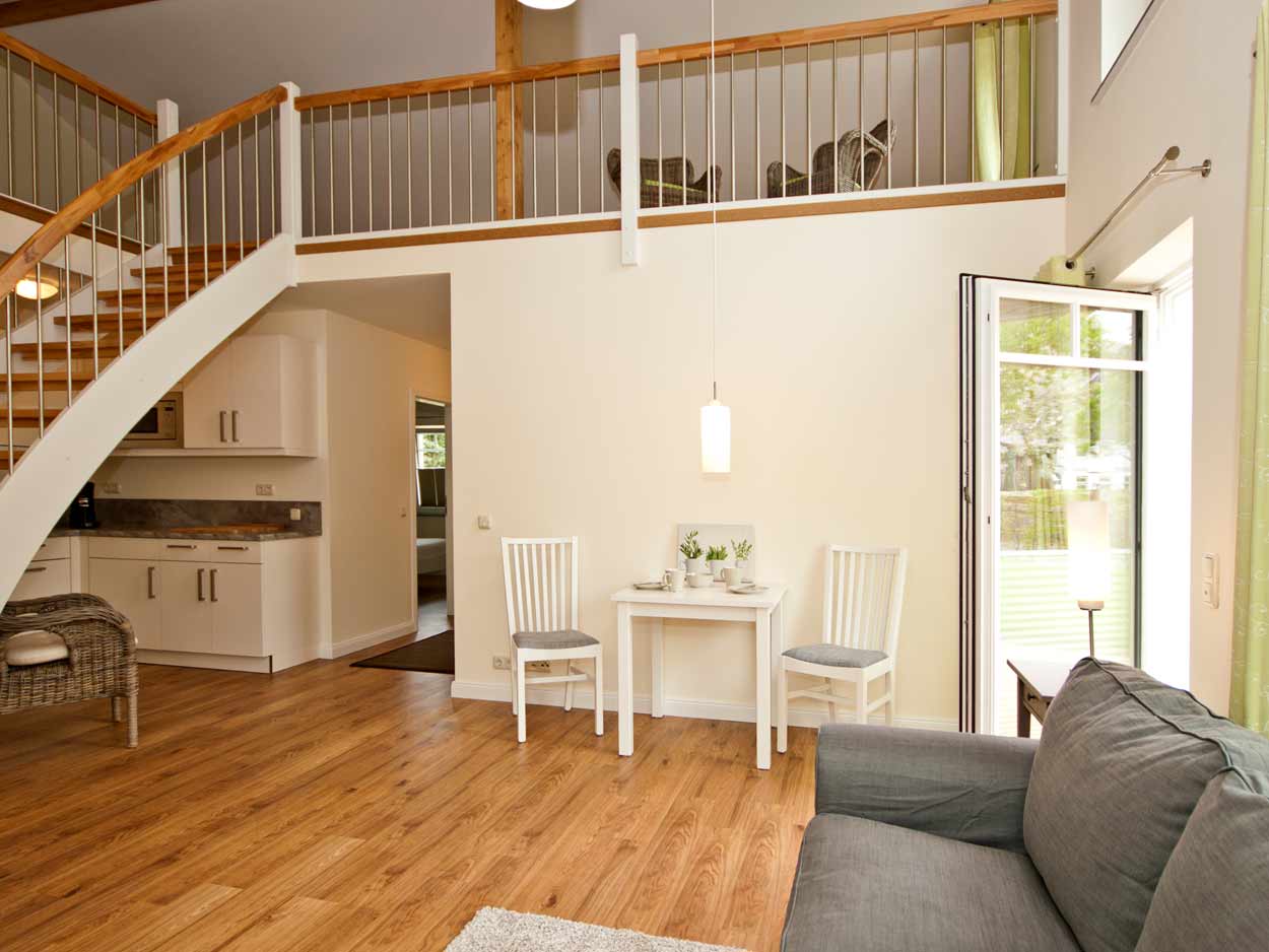 Schlafzimmer für 2 Personen / Galerie mit Leseecke sowie Schlafsofa für 2 Personen / Badezimmer mit Dusche & Badewanne / WC / Haartrockner / Kosmetikspiegel / 1 TV im SChlafzimmer/ 1 TV im wohnzimmer / Radiowecker / Teeküche inkl. Kaffeemaschine, Geschirr etc. / Wohnbereich / Essecke/ Terrasse mit Strandkorb